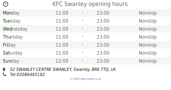 It is also possible to : Edit these OPENING HOURS of Restaurant KFC In Swanley, 52 SWANLEY CENTRE SWANLEY,